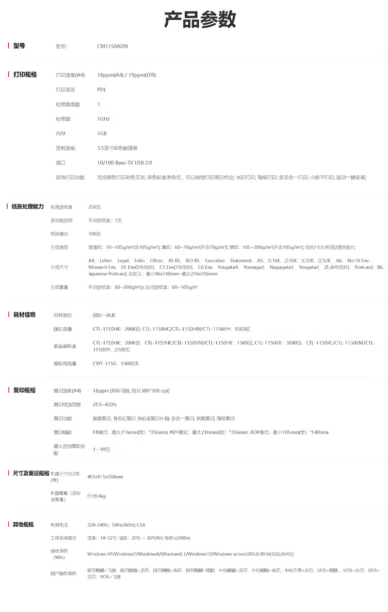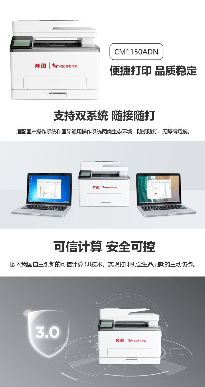 奔图/PANTUM CM1150ADN A4 彩色打印机 激光多功能一体机 A4彩色自动双面 18ppm 打印/复印/扫描 CM1150ADN
