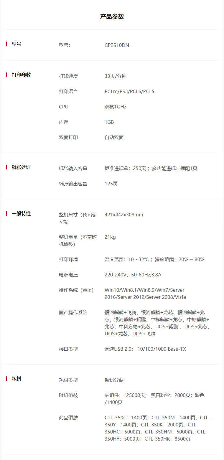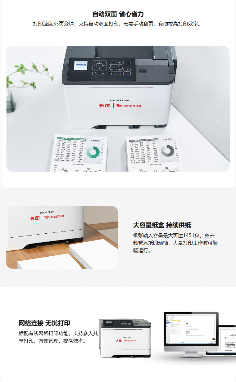 奔图/PANTUM)CP2510DN A4 彩色打印机 单功能打印机 有线网络打印自动双面打印 33页每分钟激光打印机