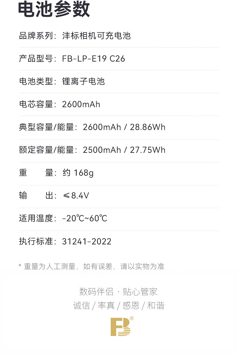 沣标/FB LP-E19 电池 通用LP-E4N佳能EOS R3 1DX3 1DX2 1Ds3 1D4 1D3 1DX微单反相机电池 【单电池】