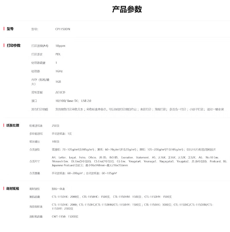 奔图/PANTUM CP1150DN A4 彩色打印机 A4彩色单功能打印机 自动双面/18ppm/有线网络打印激光打印机