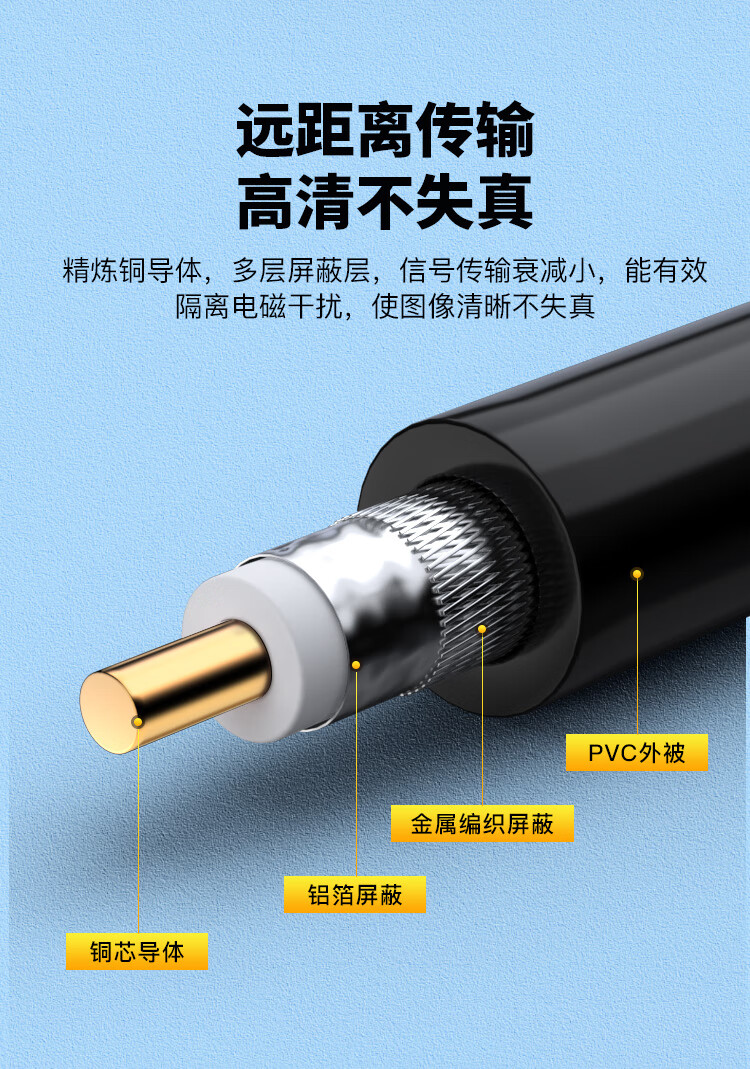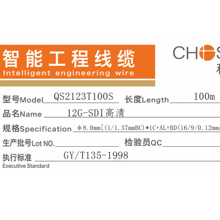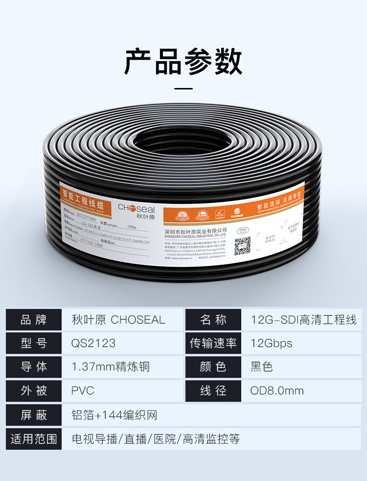 秋叶原 CHOSEAL 12G-SDI视频监控线 1080P高清数字线 摄像机摄像头 纯铜单股144编工程线 100米 QS2123T100S