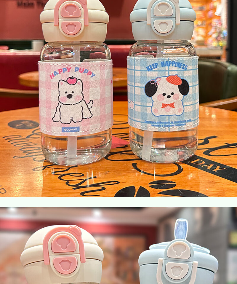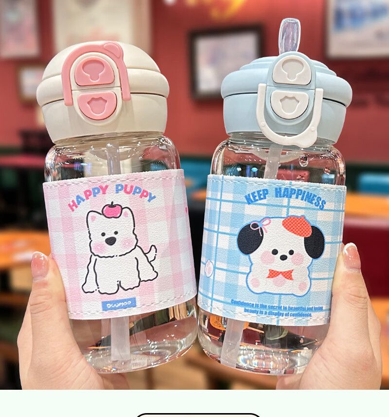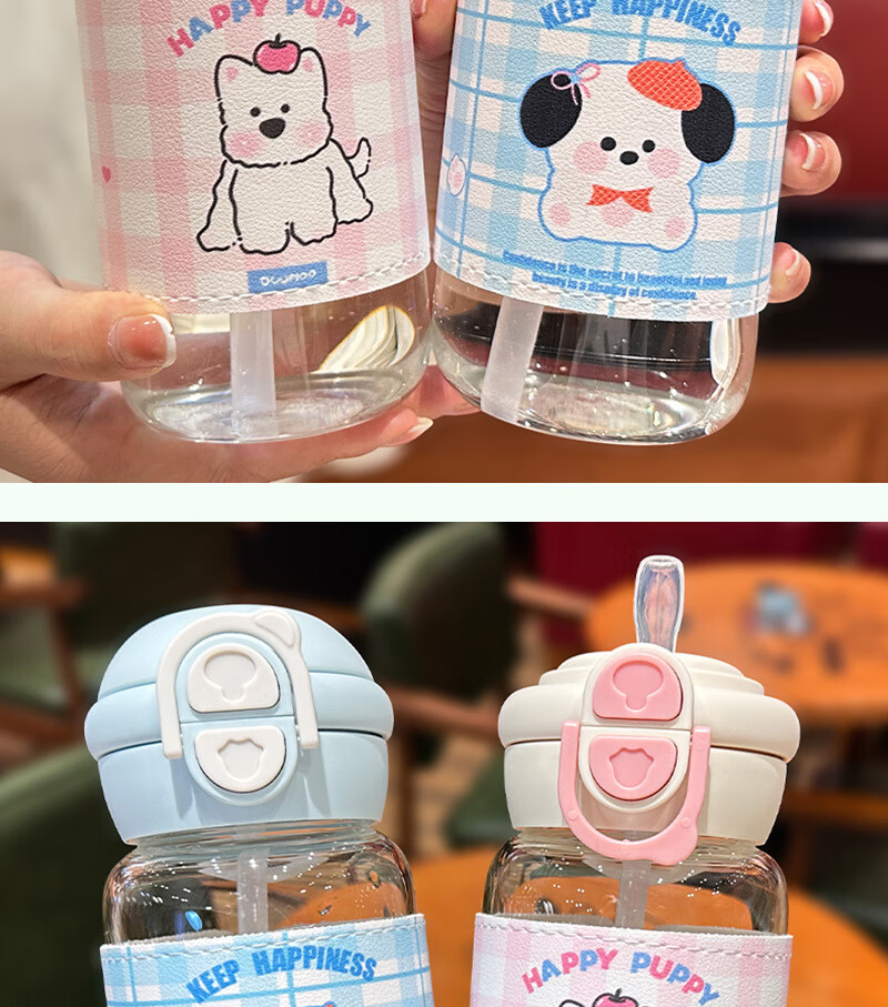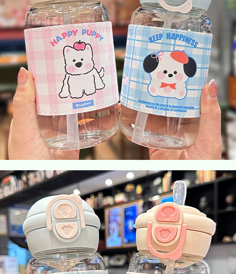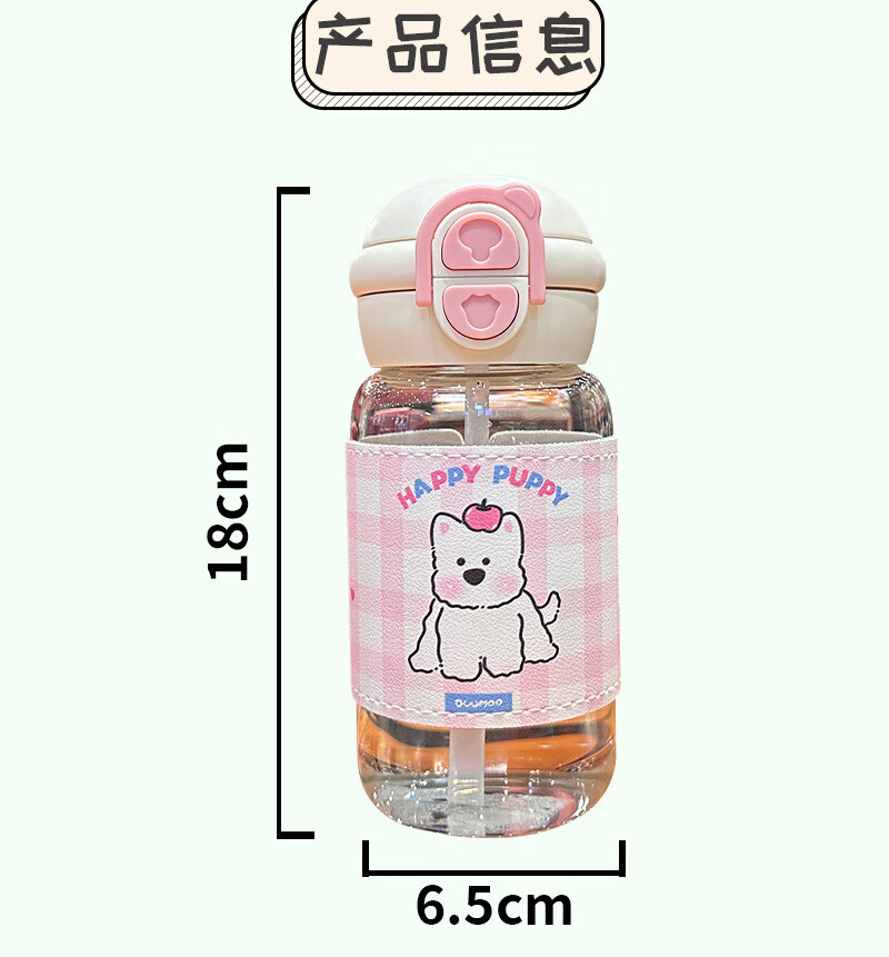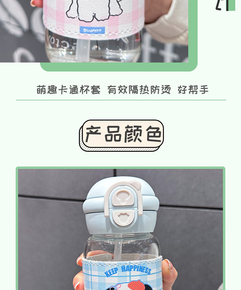 华象 8805 杯 隔热玻璃杯卡通吸管杯学生耐高温便携水杯送皮套