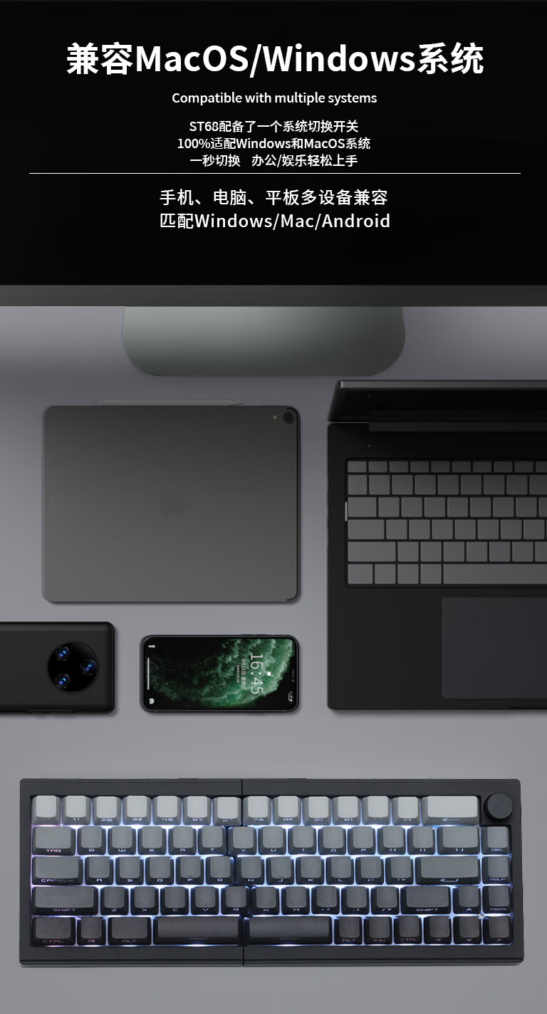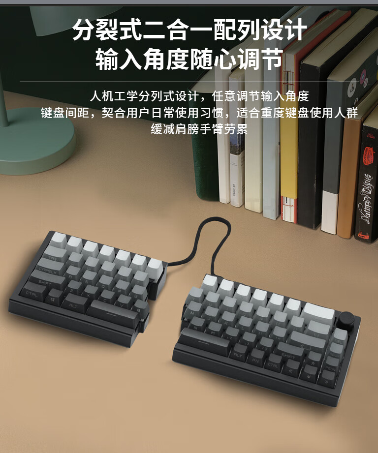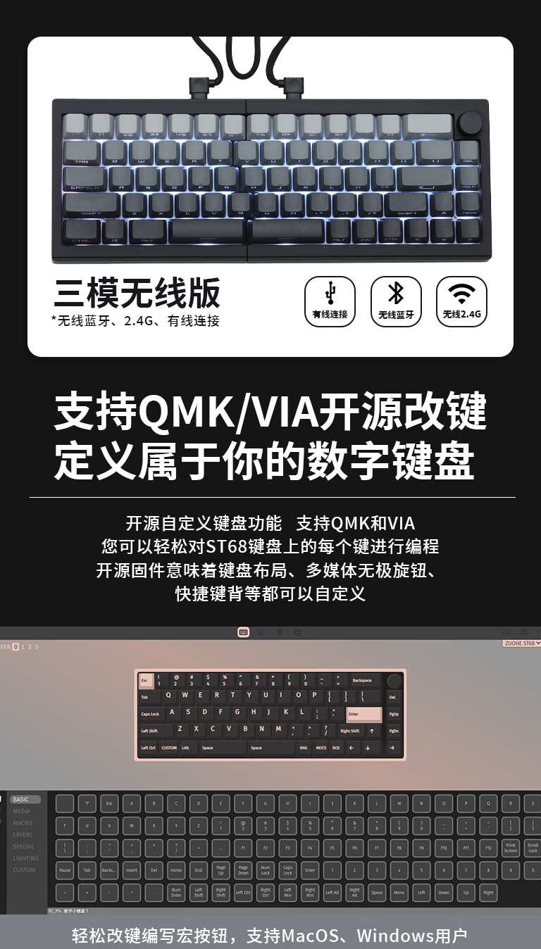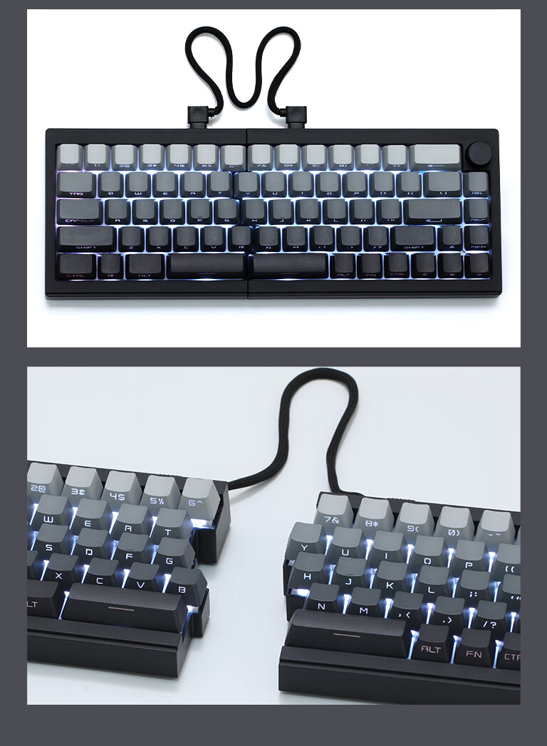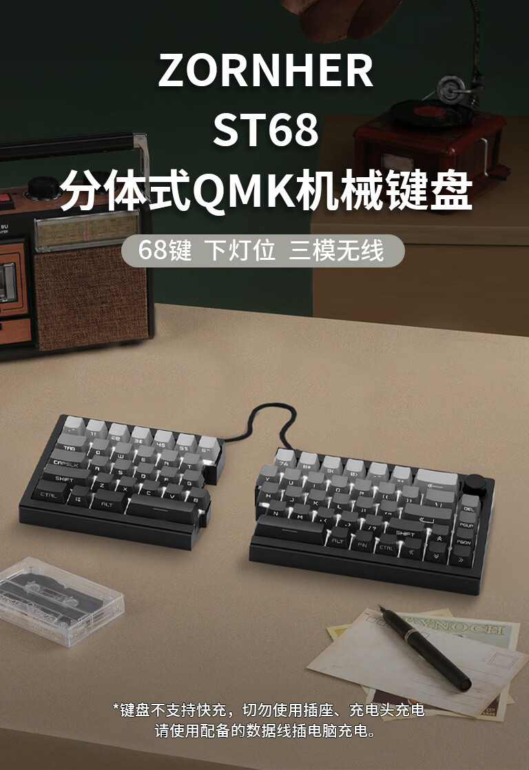 佐赫ST68分裂式分体式机械键盘无线蓝牙客制化人体工学办公静音 ST68黑色+极昼 赤璃轴【声音沉闷】
