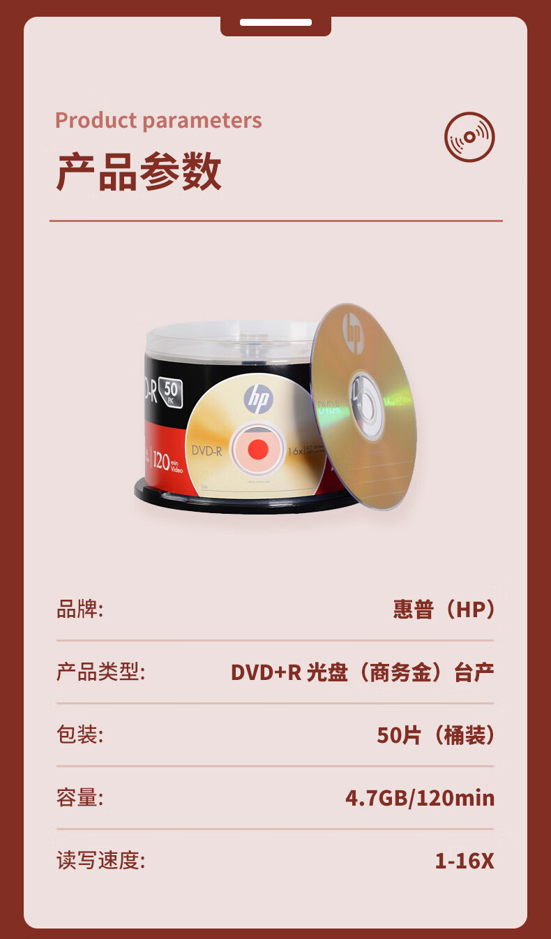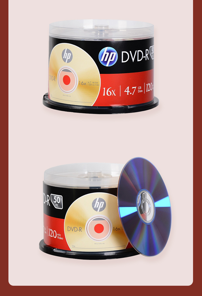 惠普/HP DVD-R 光盘 光盘/刻录盘 空白光盘 16速4.7GB 桶装50片