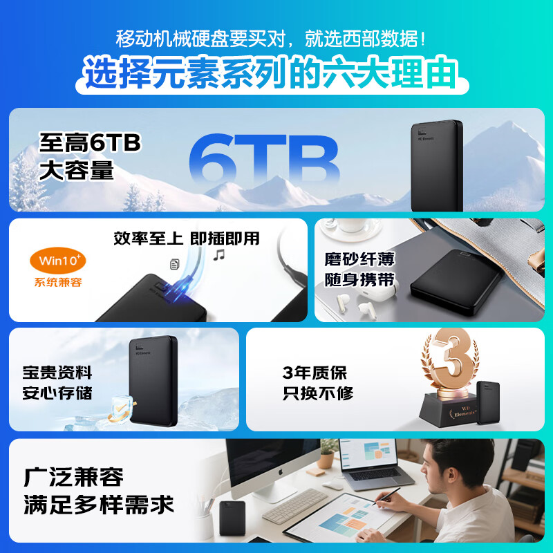 西部数据/WD WDBHJS0060BBK 移动硬盘 6TB 移动硬盘 USB3.0 元素系列 2.5英寸 笔记本电脑外接 外置扩容备份