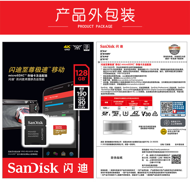 闪迪/SanDisk U3 V30 4K A2 U盘/存储卡 读速高达190MB/s