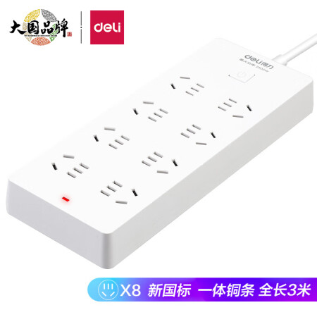 得力/deli 33643 插座 新国标安全插座/插排/插线板/接线板/排插/拖线板 总控开关 儿童保护门 8位3米 33643