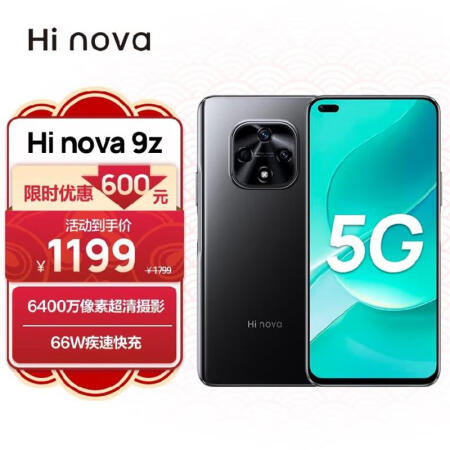 华为智选 Hi nova 9z 5G全网通手机 6.67英寸120Hz原彩屏hinova 6400万像素超清摄影 66W快充8GB+128GB亮黑色